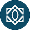 Designed Counsel brandmark logo. Wendy Estela. A circular logo with a geometric white design on a dark blue background, featuring interconnected lines and shapes forming an abstract emblem.